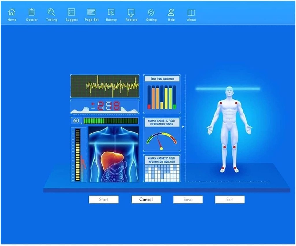 The weak electromagnetic frequency and energy of the human body are collected by holding to the QMRA Sensor. After amplification by the instrument and processed by the inbuilt micro processor, the data is compared with the standard spectrum of diseases, nutrition and other indicators incorporated within the instrument to analyse whether the sample waveform are regular or irregular using the Fourier principle approach.